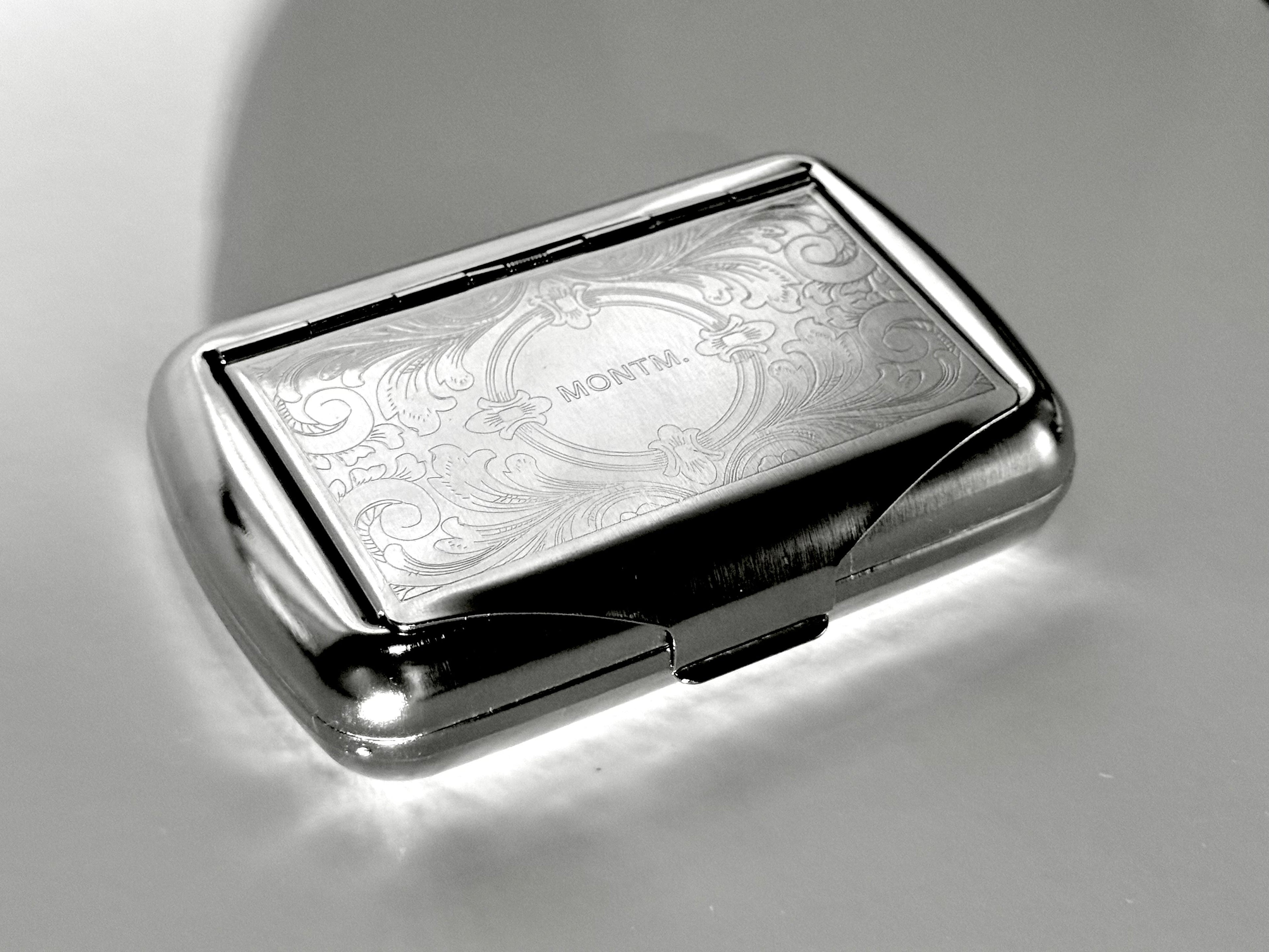 Porta Tabaco com espaço para Sedas — Case MONTM. Gravado em metal polido.
