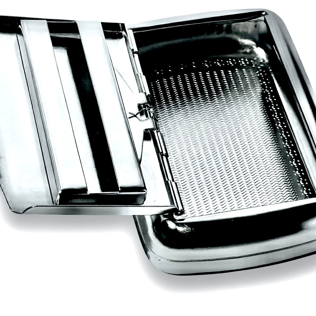 Fabricado em metal de alta qualidade, o estojo possui um acabamento gravado em relevo, com detalhes florais que conferem um toque clássico e refinado.